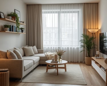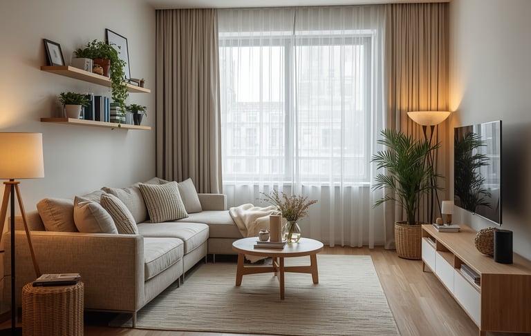 Cuando el espacio es limitado, cada elemento debe sumar. Elige muebles que cumplan más de una función (mesa con almacenaje, estanterías abiertas que decoran y organizan).
